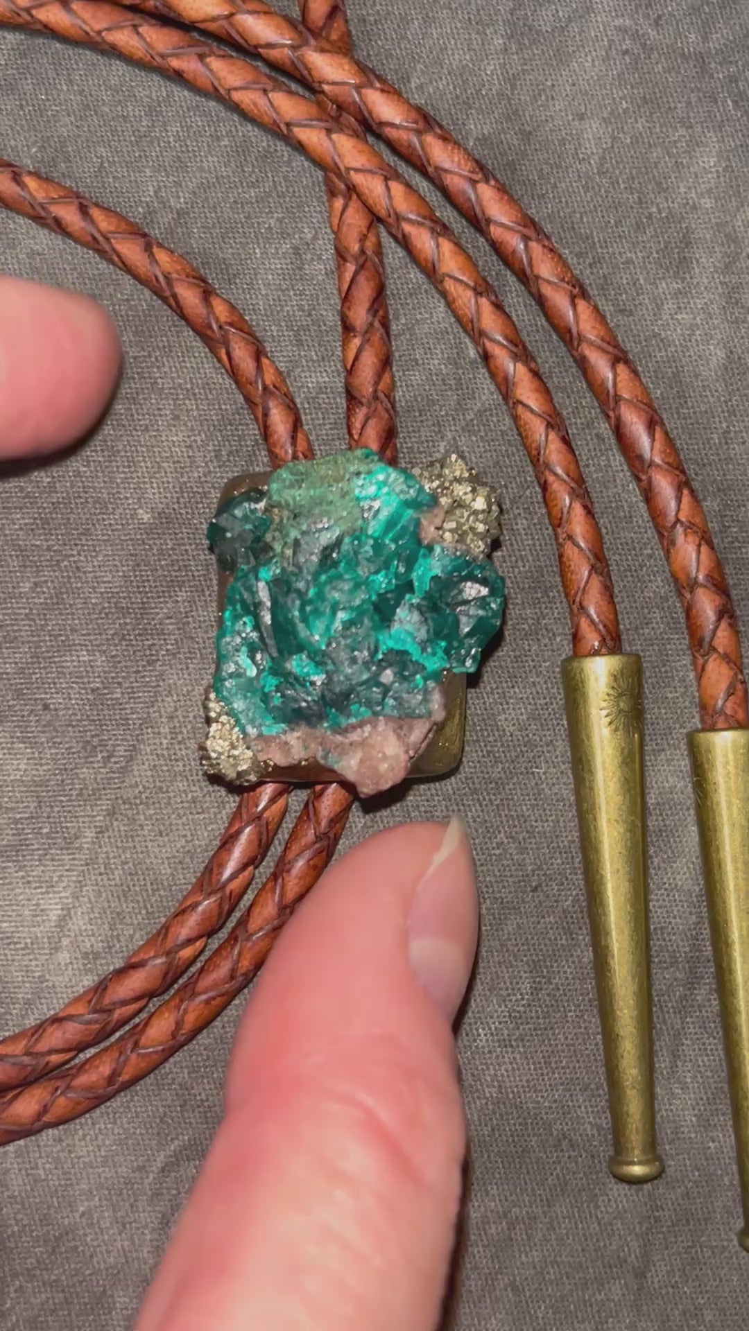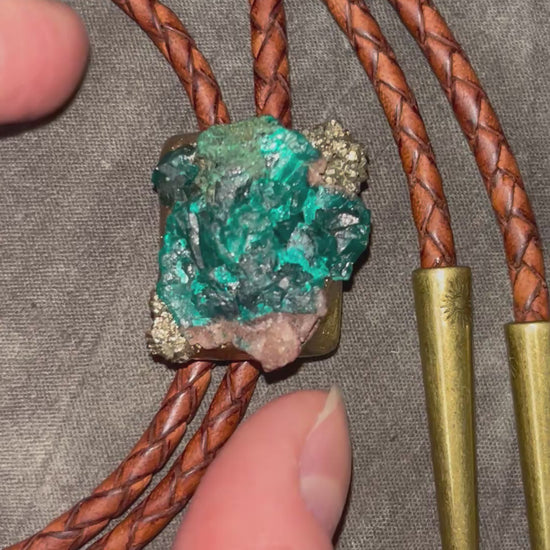 Materials: Pyrite, Dioptase, Leather, Lightweight Sculptural Setting, Brass Bolo Back and Tips